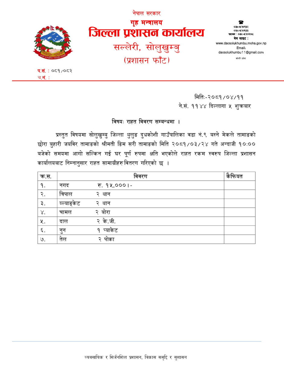 प्रस्तुत विषयमा सोलुखुम्बु जिल्ला थुलुङ दुधकोशी गाउँपालिका वडा नं.९ बस्ने मेकले तामाङको छोरा बुहारी जयविर तामाङको श्रीमती ङिम सरी तामाङको मिति २०८१।०३।२४ गते अन्दाजी १०:०० बजेको समयमा आगो सल्किन गई घर पूर्ण रुपमा क्षति भएकोले राहत रकम स्वरुप जिल्ला प्रशास