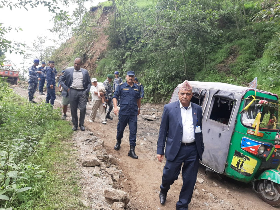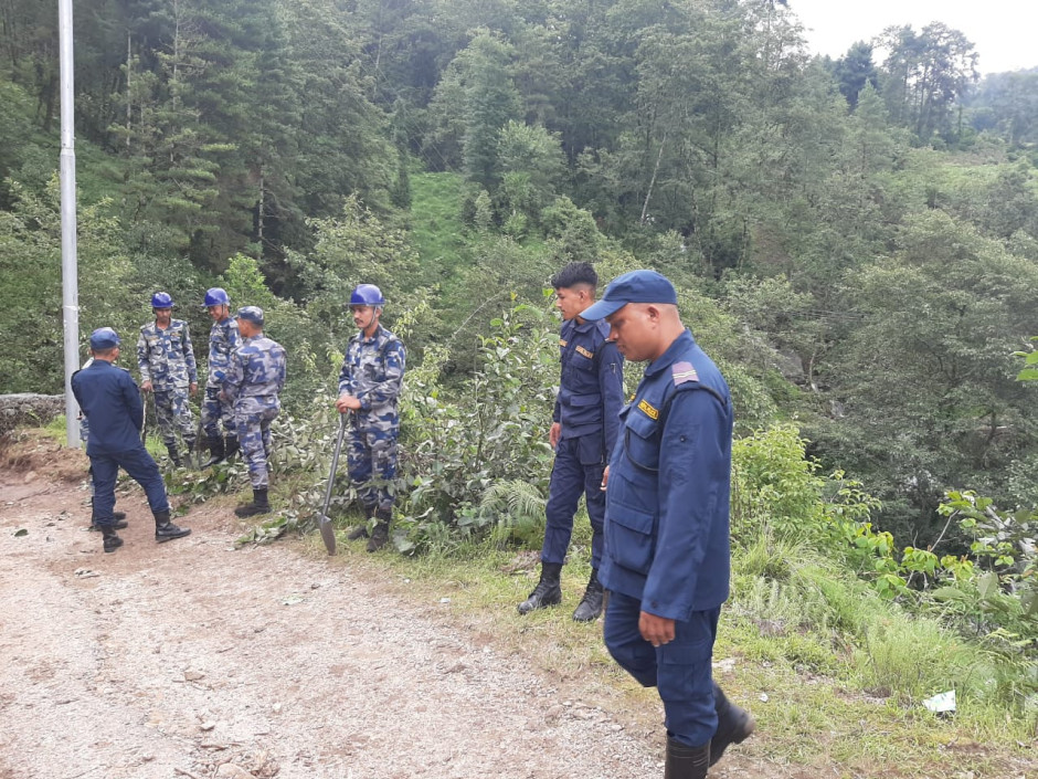 थुलुङ दुधकोशी गाउँपालिका वडा नं. १ र सोलुदुधकुण्ड नगरपालिका वडा नं.७ को सिमानामा रहेको भित्ते खोलामा गए राति गएको पहिरोको जिल्ला सुरक्षा समितिद्वारा पहिरोको स्थलगत निरिक्षण गर्दै।