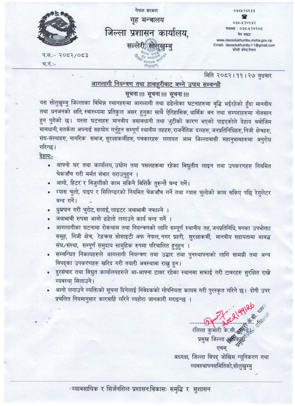 तस्बिर : आगलागी नियन्त्रण तथा हावाहुरीबाट बच्ने उपाय सम्बन्धी जारी गरिएको सूचना ।